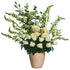 Snapdragon y lirios en tonos blancos y delicado follaje, colocado en una hermosa base de cerámica