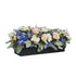 Centro de mesa rectangular, compuesto por clavel, mini rosas, delphinium belladona y follaje con textura única, colocado sobre una base de madera.